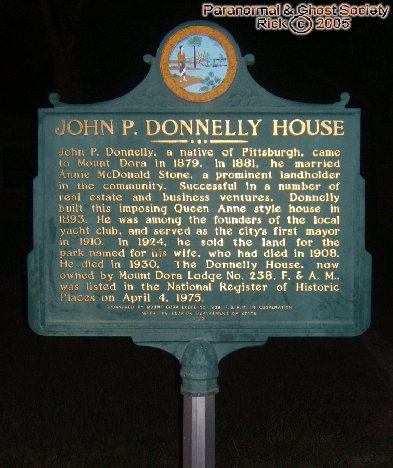 John P. Donnelly was a native of Pittsburgh and came to the Mount Dora area around 1879. In 1881 he married a woman by the name of Annie Mc Donald Stone which was a very prominent landholder in the community. She was very successful in real estate and business ventures. In 1893 he built the Donnelly house which was a Queen Anne Style House with three stories and a basement underground. He was the founder of the local Yacht club and served as the cities first mayor in 1910. Unfortunately in 1908 Donnelly's wife passed away. In 1924 he sold the land which would be dedicated to his wife for a park. Eventually he had passed away in 1930. Today the house is now the site of the Mount Dora Masonic Lodge #238. The house has an octagonal turret and a wrap around porch. It is absolutely gorgeous with stained glass windows, Masonic symbols engraved into some of the windows, weather vane's etc it is a real beautiful home. The house originally had 160 acres which John and had homesteaded. Their is a building on the local campus of the Montverde Academy that is named after him cause he made numerous contributions. The park which was purchased for 45,000 dollars from the city was established by the Mount Dora Woman's Club which was found in 1919. In 1926 two shuffle board courts were installed and organized mount Dora's first shuffleboard club. By 1960 the park had grown to have 22 courts. Today their is a time capsule in the park, memorial benches, a veteran memorial, tennis courts, and a recreational center for various town events. The Donnelly House was put on the national register of historic places in 1975 and the park was called the Annie E. Mc Donald Stone Donnell Park. Surrounding the park and house is downtown Mount Dora which is full of many small shops, historical mansions, dimly lit lamps which run along brick walkways, and many historical sites. It really is a very eerie yet amazing little area. Since the park serves as a focal point of the town its only natural for various energies to be present here and if that does not get to you the amazing Donnelly House will. © By Rick-LordOfThyNight