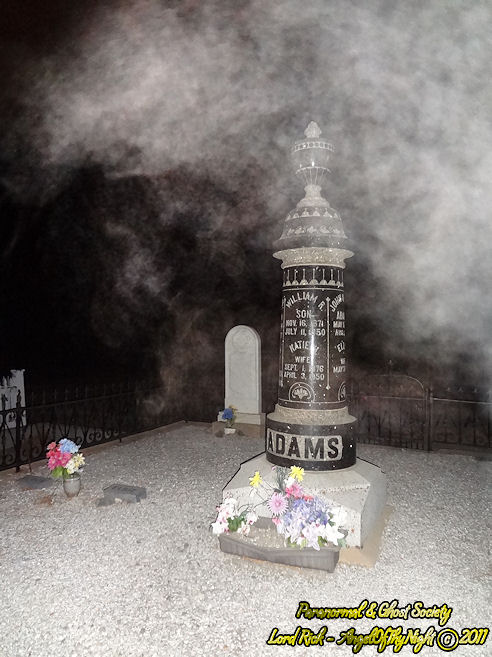 We found in the center of the cemetery some very large monuments including a massive granite memorial. There was another gravesite surrounded by a wood fence up on rocks. There appeared to be older burials mixed in with newer ones in the center of the cemetery. There is also allot of large trees which surround many of the gravesites giving us the full eerie effect under the moon.