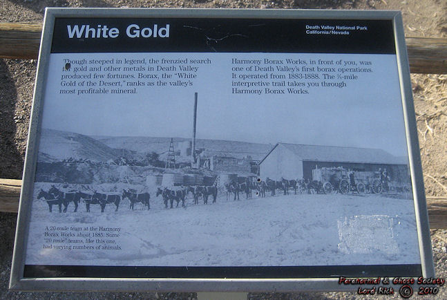 ![]() ![]() ![]() ![]() ![]() ![]() ![]() ![]() ![]() ![]() ![]() ![]() ![]() ![]() ![]() ![]() ![]() Borax was a huge commodity found in Death Valley thus it was mined at locations such as this one. What is unique about Harmony is the fact that much of the works still remains thus it is a major attraction in Death Valley. Below are the plaques which describe these works in a little more detail so make sure you check them out. Back in the day they had a twenty mule team to deliver the processed borax which is used in today's laundry detergents. But others used it to such as meat packers and even morticians. In 1881 Aaron Winters discovered Borax at this location then later sold his holdings to a W.T. Coleman of San Francisco. In 1882 Coleman built this works which processed the Borax then it could be shipped out by wagon. A Man by the name of J.W.S. Perry to design the wagons that would be able to endure a trip through the Mojave. This trip would take 10 days to achieve as it traveled 165 Miles to the nearest Railroad until 1889 when the railroad ran deeper into the Death Valley area. Harmony was ran by about 40 Chinese men and they lived in cabins surrounding the works like most mining camps. The company produced about 3 tons of Borax a day and when the weather was to hot that the water could not cool enough to permit the suspended borax to crystallize work was moved to Tecopa Ca. The borax mines in Tecopa I did not visit but I did drive past them and thought about investigating them. It is amazing how small of a world it is when we think of American Western History. In 1888 Harmony's owner suffered major financial issues thus causing the shut down of the mill. Eventually the site became part of the Borax reserves for the Pacific Coast Borax Company which also had some operations in Death Valley Junction. In 1974 it was designated as a historical site and today many roam its tiers to help understand the importance of the borax industry in Death Valley over a century ago. By Lord Rick ![]() ![]() ![]() ![]() ![]() ![]()