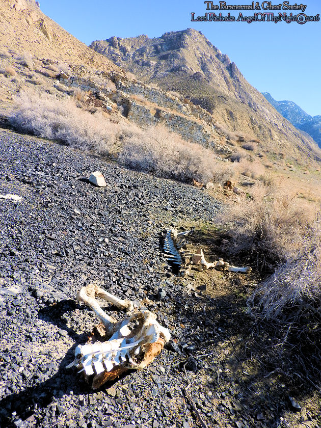 | While this is nothing more then the laws of nature it is something you will find often which is death in the desert where water is scarce and the elements are harsh. It is a free range throughout Nevada so this means wild horses and cattle have allot of freedom to journey. Sometimes these cattle and wild horses make it up to a ghost town like White Cloud City looking for food perhaps water ending up meeting their demise. Other times mountain lions will come down off the range or down from the rugged canyons to hunt. Either way all that eventually remains in a short time is bones reminding us once in awhile that life on the range is not always so easy and even if it appears beautiful the truth is death is imminent. Also Tammy is holding a rock in her hands but its know normal rock or mineral. The sample we took came from a large burnt circular area on the ground that may have been caused by a lightening strike or meteor strike. I also wanted to add that a buddy of mine has a son who does allot of hunting and one day he was out hiking the Stillwater Range when he seen a pack of mountain lions hunting together. Mountain Lions do not hunt in packs but for some reason they often do it here within the Stillwater Range which boast the canyon where White Cloud City is found. Beyond the canyon is open desert a region known as the Carson Sink which is harsh but food and water also very scarce therefore life is not paradise here and that is why locations like White Cloud City end up going from boom to bust! |